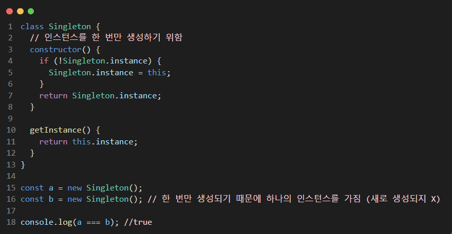 싱글톤 패턴 (Singleton Pattern) 전체 시스템에서 클래스에 대해 오직 하나의 인스턴스만 가지도록 하는 객체 생성 패턴 하나의 객체를 생성하면 생성된 객체를 어디서든 참조 가능 인스턴스에 집적적인 접근 차단 예제 1 : 즉시 실행 함수 (IIFE) + 클로저 (Closure) 즉시 실행 함수 : 함수를 정의하자마자 바로 호출되는 함수 (초기화코드, 라이브러리 내 전역 변수의 충돌방지 등에 사용) let Singleton = (function () { let instance; // instance 비공개 변수 function init() { // 비공개 메서드 return { publicMethod: function () { // public 메서드 return {name: 'yejin', a..